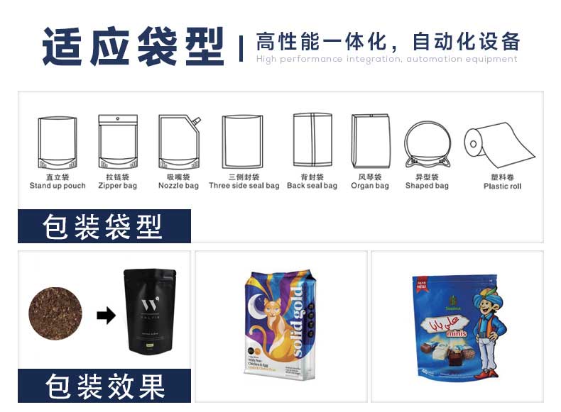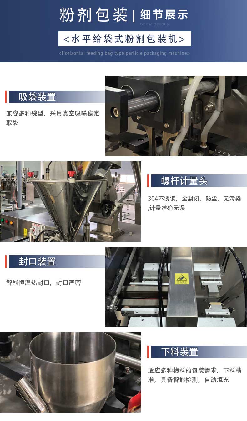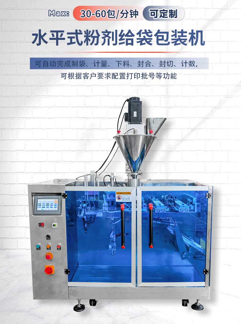 產(chǎn)品用途:適用于蛋白粉、奶粉、營養(yǎng)粉、高鈣粉、膠原蛋白粉等粉劑類預(yù)制袋包裝機